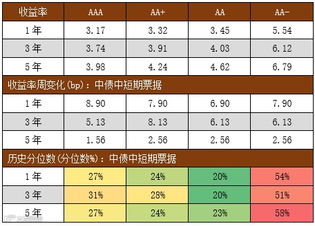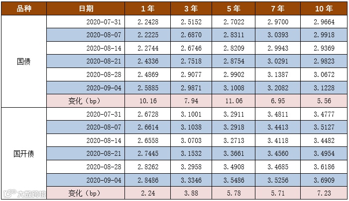 上周利率整体上行,1-5年期的中短端国债,以及5-7年期的中长端国开债调整幅度大。