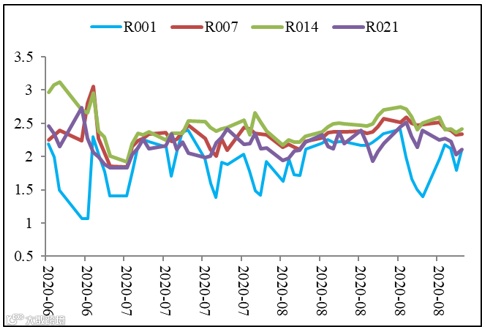除隔夜品种大幅上行外,银行间资金利率整体小幅回落。截止至周五,R001加权收于2.09%,较前一周上行69bp;R007加权收于2.34%,较前一周下行14bp;R014加权收于2.41%,较前一周下行9bp;R021加权收于2.11%,较前一周下行29bp。