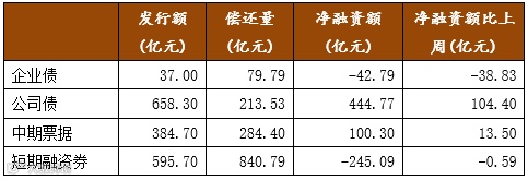 一级市场:非金融企业短融、中票、企业债、公司债发行量、偿还量、净融资额(与上周比较)