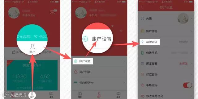 打开及第理财APP,通过“账户—账户设置—风险测评”填写问卷,即可得到相应的风险评级。