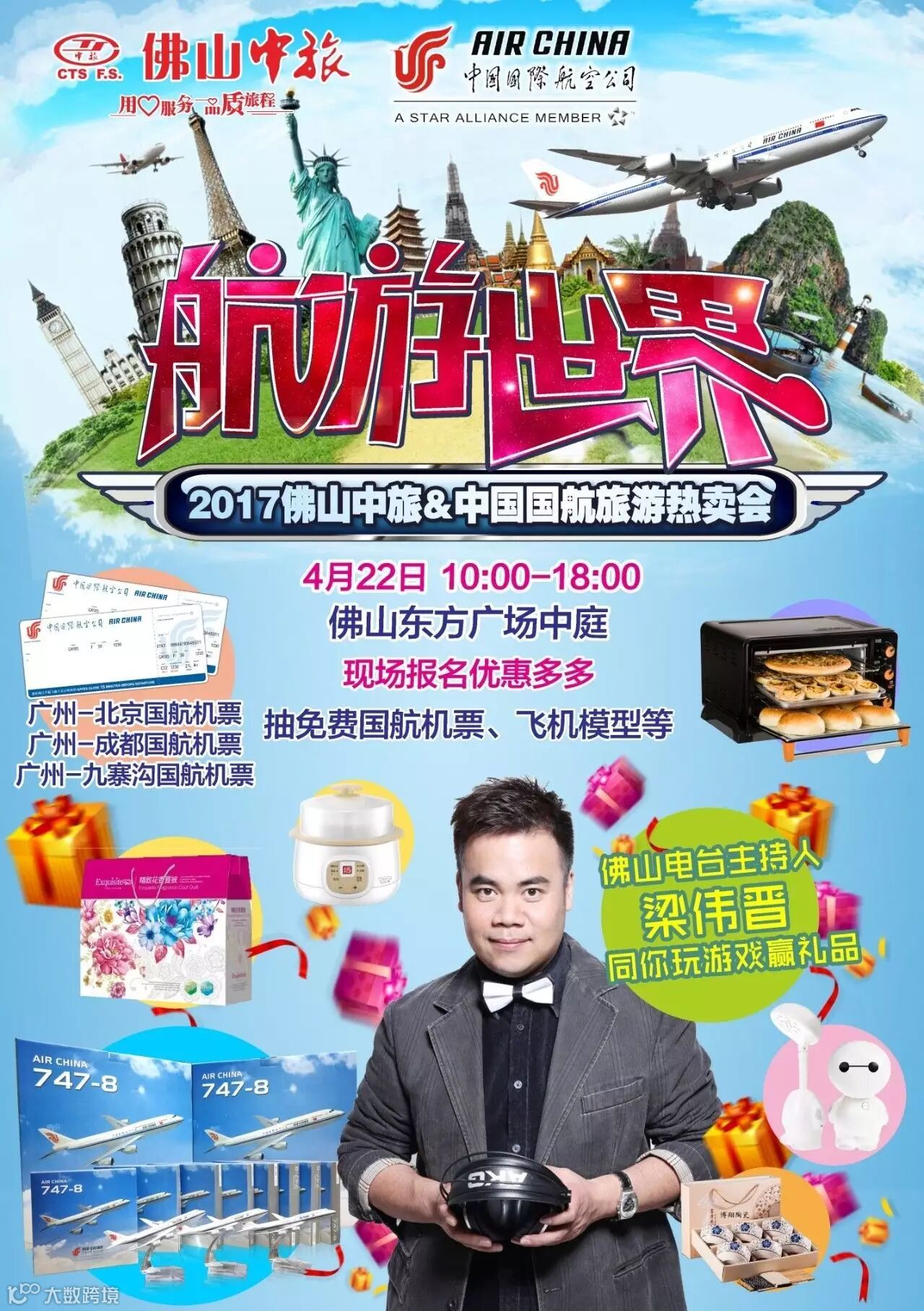 佛山中旅携手中国国际航空公司联合举办《航游世界》2017佛山中旅&中国国航旅游热卖会,除了有超值的爆款线路,还有FM985《驾驶行》DJ梁伟晋同你玩游戏赢礼品,现场报名厚礼多多,还有机票大奖等着您!