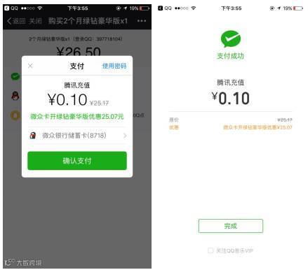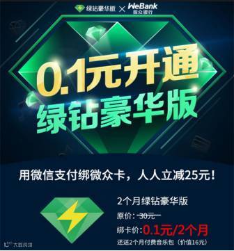 即日起至9月15日,用微信支付绑定微众卡,即可享受0.1元开通2个月绿钻豪华版!