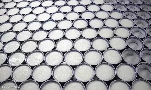 ▲静置中的鲜牛奶,右方的空碗剩下的就是奶皮了。