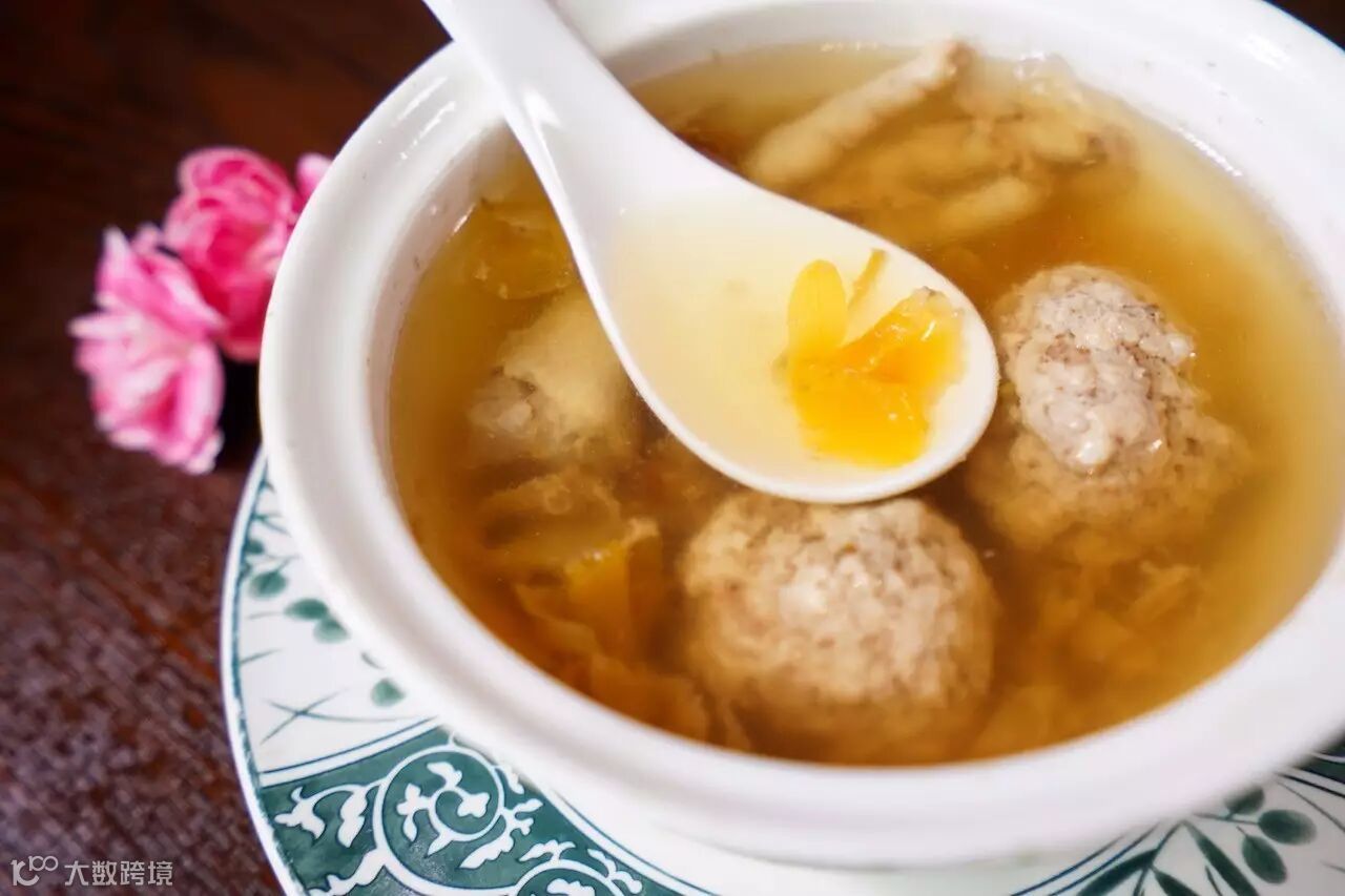 石斛花肉汁炖桃胶,将瘦肉切碎成丸,加上焯水后的鸡脚、桃胶和石斛花,炖上数小时。汤汁鲜美,略带着一点点石斛花清新的气息。