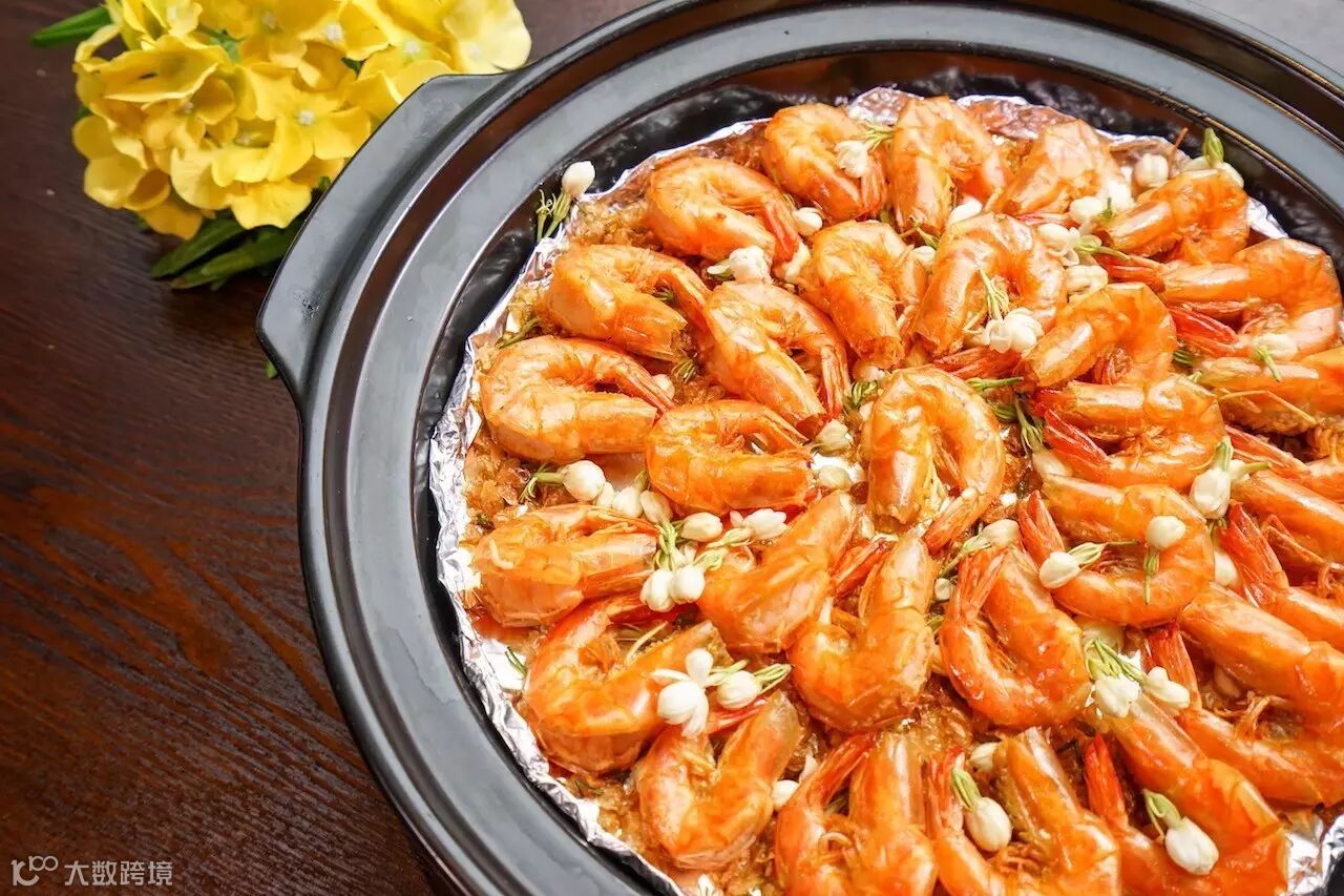 茉莉花盐焗大虾入味的关键点是先把浸开的茉莉花和大虾一起放入油锅炸脆,然后放入炒好的盐煲里焗。让茉莉花的味道完全渗入至虾肉肉中,这卖相和味道两不误!