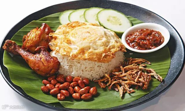 用椰浆蒸煮而成的饭,佐以咖喱鸡、牛肉或鱿鱼、黄瓜、炒江鱼仔以及三巴辣椒酱,整齐地放在香蕉叶片里,似乎带有异域风味,又保持着当地特色,非常可口。