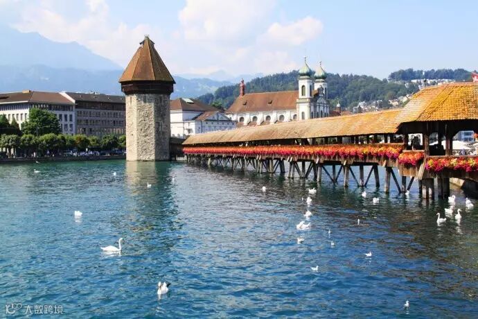 琉森 卡贝尔桥又称教堂桥,花桥,于14世纪初建造的带屋檐的木质桥,中间有八角形的水塔,是琉森的标志性建筑。