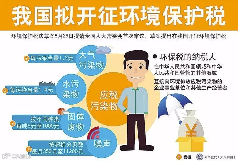 草案拟将现行的“排污费”改为“环保税”,将现行排污费收费标准作为环境保护税的税额下限,规定应税污染物包括