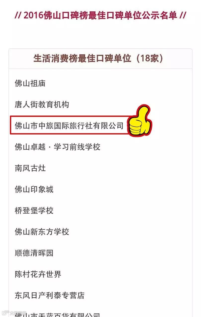 佛山中旅连续三年荣登佛山口碑榜,用真诚和用心的服务,赢得了广大市民对佛山中旅的认可和支持,我们将以荣誉为鞭策,把口碑的力量化作前进的动力,继续努力提升服务质量和群众满意度,成为市民心口相传的“口碑”旅行社!