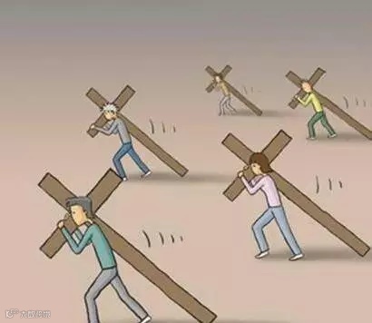 第一幅漫画中,每个人都背负着一个沉重的十字架,在缓慢而 艰难地前行!
