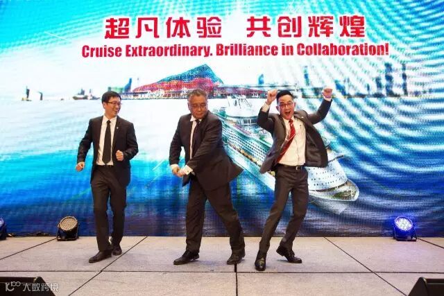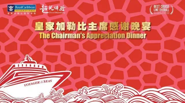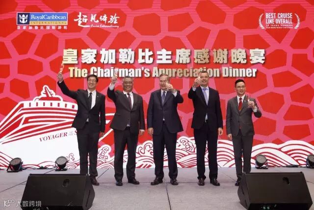 夜幕降临,当日的重头戏“皇家加勒比主席感谢晚宴”隆重上演。来自皇家加勒比集团的三位重量级嘉宾悉数到场——皇家加勒比游轮集团全球董事会主席兼首席执行官Richard Fain先生,皇家加勒比国际游轮全球总裁兼首席执行官Michael Bayley先生,皇家加勒比国际游轮中国及北亚区总裁刘淄楠博士,彰显晚宴的超高规格。