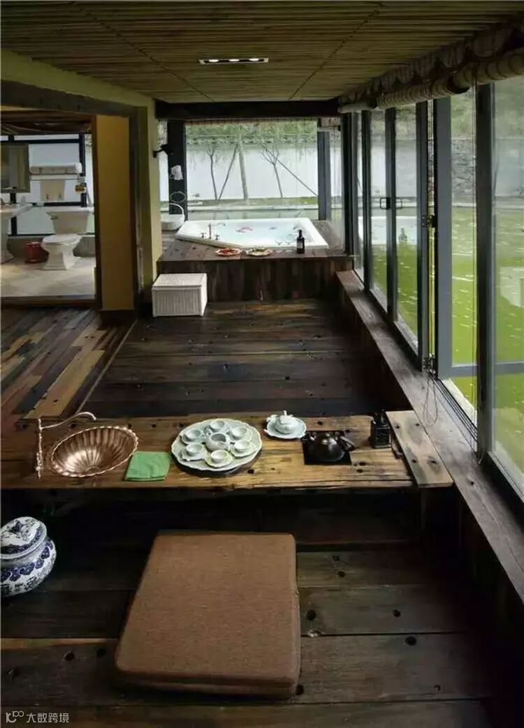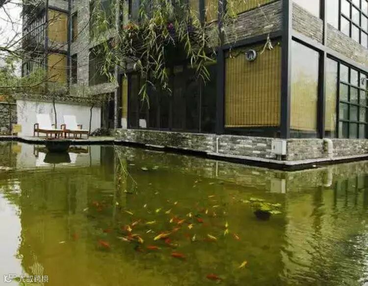 观鱼房: 60平方米房间外面环绕着超大锦鲤鱼池,可以在窗边一边喝茶一边赏鱼,也可以泡在浴缸里赏鱼,怡然自得。