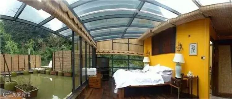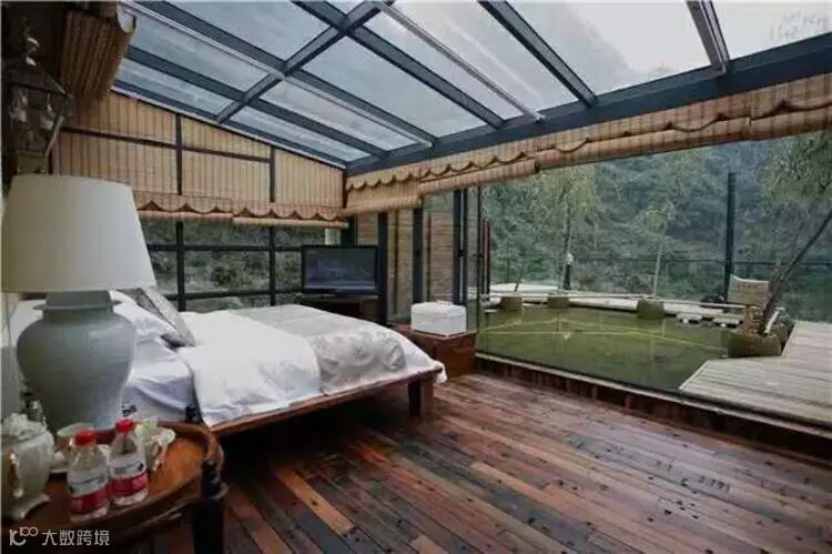观星房: 房间侧面及顶上的竹帘都能掀起,仿佛就是睡在一个透明的玻璃罩中,晚上可以观星,房间还配有超大露台,露台上设有浴缸,可以一边泡澡一边看壮丽山景。