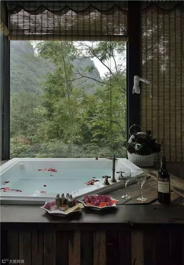 “执子之手,与之谐老”,与观鱼、观景房相比,顶层的观星套房,无疑是一境最品位、最浪漫的屋子了。纤尘不染的玻璃屋顶,全景式的玻璃长窗,豪华的垂帘帷幔,飘散着玫瑰花瓣的露天浴缸,让身心全方位地与日月星辰草木山林融为一体。在海棠微雨或落霞满天的初夏,在梧桐飘零或银霜胜雪的初冬,与那个爱你和你爱的人看碧山暮云、等繁星入梦。执手相约,牵手一生。任岁月流转,任天涯路长