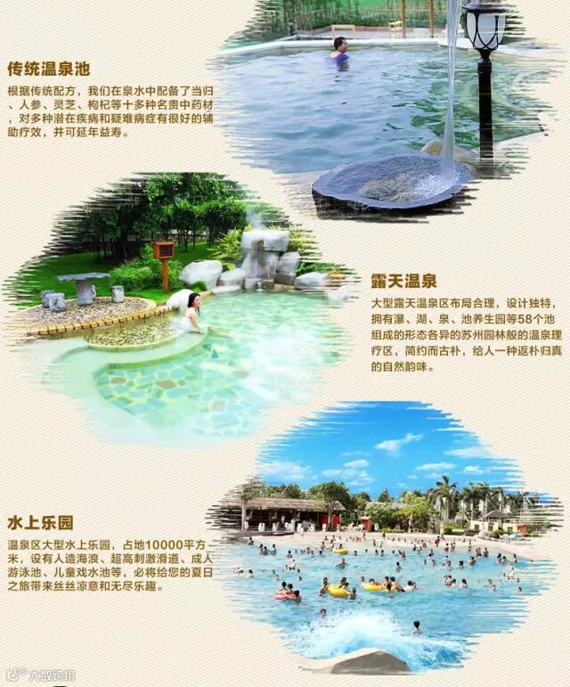 阳江温泉以天然温泉取胜。大型露天温泉区布局合理,设计独特,拥瀑、湖、泉、池养生园等58个池组成的形态各异的苏州园林般的温泉理疗区,简约而古朴,给人一种返朴归真的自然韵味。“山中有瀑、瀑中有洞、洞中有泉”,瞬间让您验“春、夏、秋”三季不同温度的水上世界,让您尽情体验阳江温泉度假村奇妙的亲水之旅。近80套豪华贵宾按摩房,设施先进,特聘专业理疗师提供中式按摩及其它专业康体理疗服务