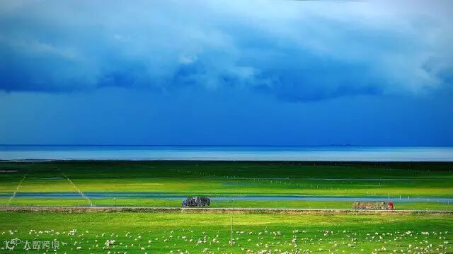 白天的黑马河,一半翠绿一半湛蓝,无数的牛羊悠然的吃草。