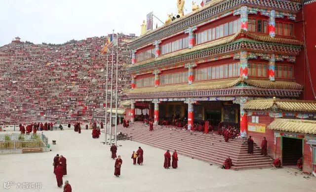 在佛学院最高的山峰上,有一个金碧辉煌的建筑,叫做"坛城"。它的上半部分是转经的地方,据说如果你有什么疾病,在这里转上一百圈就能够好;下面一层是转经筒,金色的圆筒在人们干枯的手转过之后留下一串悠长的嘎吱嘎吱的响声。