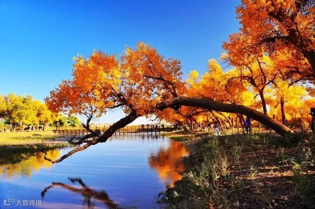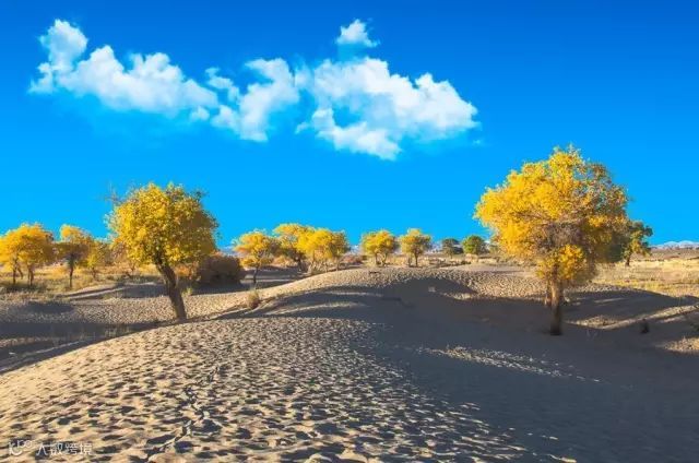 这里的胡杨树林在茫茫戈壁上屹立千年,一到秋季就美得不可方物。