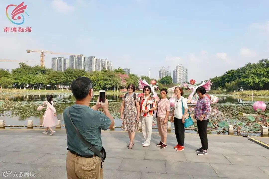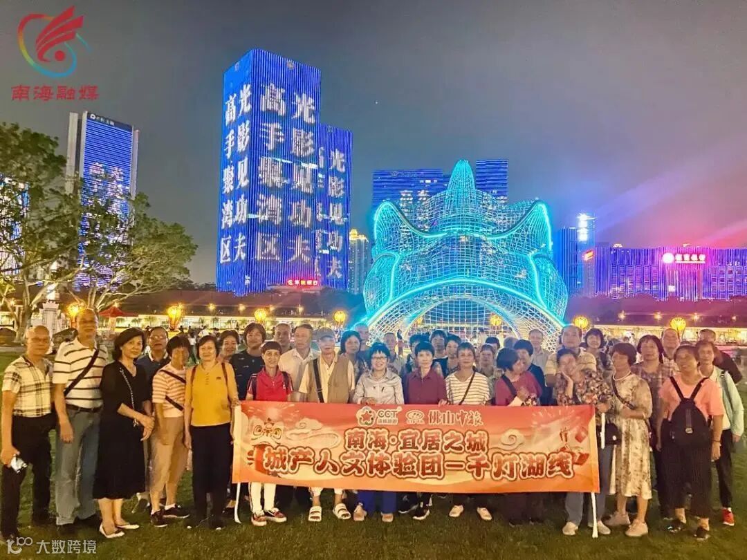 晚上,团友齐聚千灯湖,欣赏光影交错的灯湖美景。在这里,他们沉浸在地标建筑《醒》的金属外壳与潮流的碰撞中,现场放映的大型数字文旅作品《南海潮》以大楼、公园等城市空间为幕布,结合舞台歌舞,讲述了南海历史文化、经济发展等,让各位团友愈发被南海这座城市的魅力所吸引。