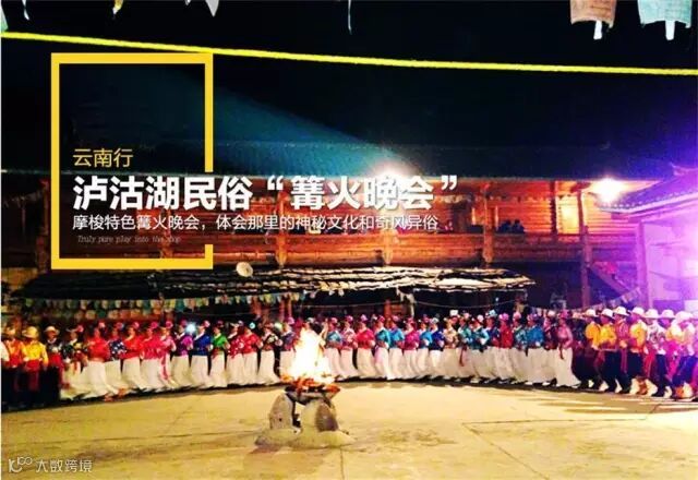 与摩梭姑娘、小伙对唱情歌,学跳摩梭舞—甲搓体舞,狂欢夜。