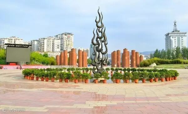 西昌火把广场以演艺中心为主,融学术交流、展览、休闲、娱乐为一体的多功能文化建筑。有一组九虎塑像,往里是一组成弧形布置的56个直径为2米的民族文化柱群,56根柱子表示56个民族大团结。