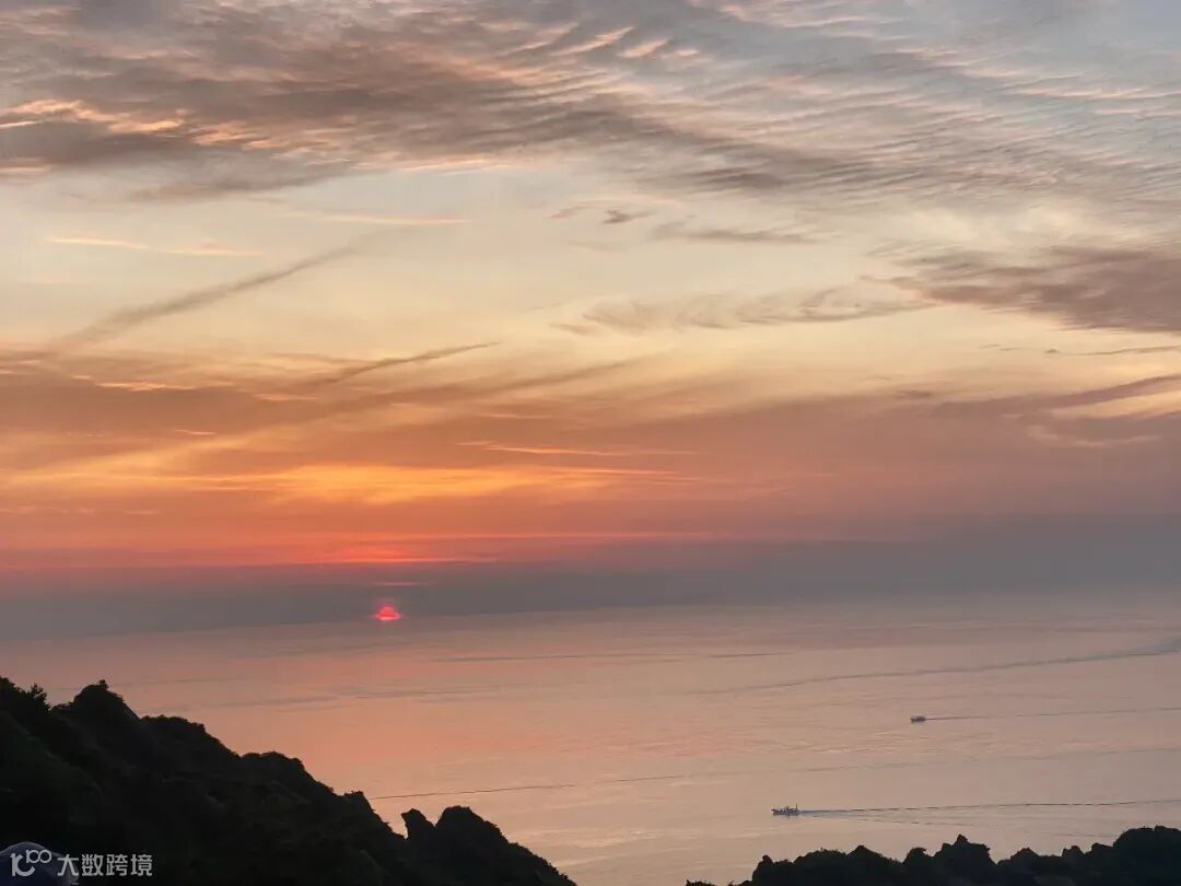 当天边呈现出若隐若现的橙色,橙红色的阳光从云缝里照射下来,那无垠的天空和大海中,一下子就布满了耀眼的橙红色的光。