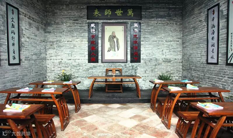 进门左边就是一古代私塾格局,孔圣人像在主墙高挂,座椅齐备,墙上挂上山水荷花,书香四溢,耳边仿佛听见儿童们朗朗的读书声。