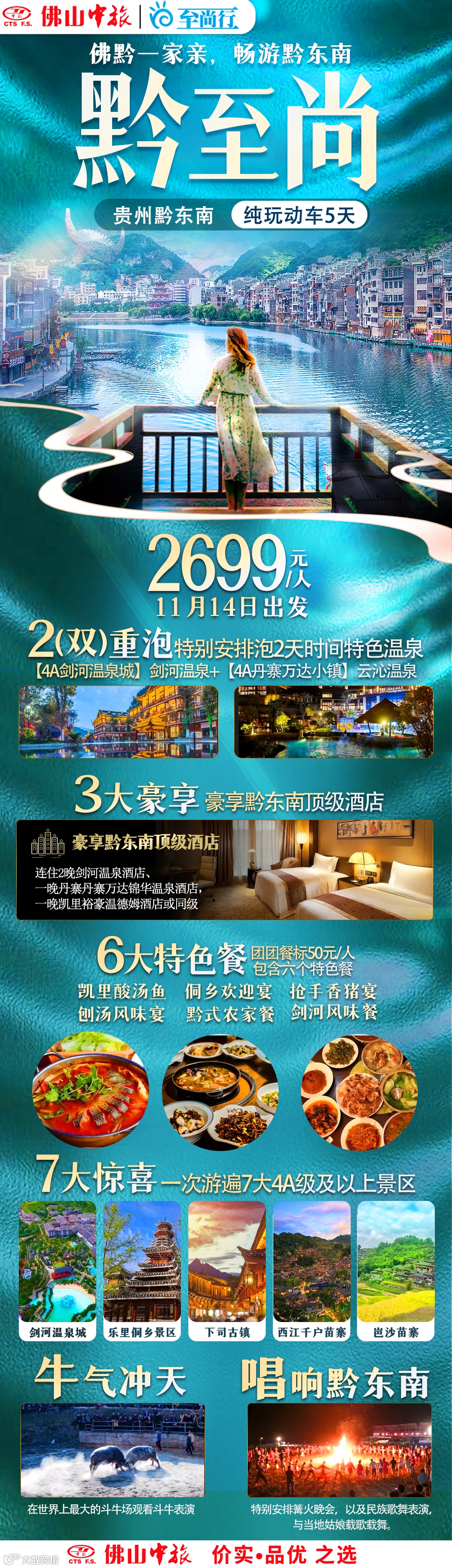 “黔至尚”线路亮点众多:2(双)重泡苗疆圣水(剑河温泉+万达云泉);3大豪享黔东南顶级酒店;6大特色餐(抢手香猪宴、凯里酸汤鱼等);7大惊喜,畅游黔东南七个4A级以上的景区,安排参观世界上最大的斗牛场,以及观看斗牛表演,观看民族哥舞表演,参与民族大融合的篝火晚会。2367唱牛的特色行程,征服了佛山游客,反响热列,几天时间一百名名额预订爆满。在主管部门的重视和指引下,“佛黔一家亲,畅游黔东南”10月18日百名游客在广州南站盛大启行。