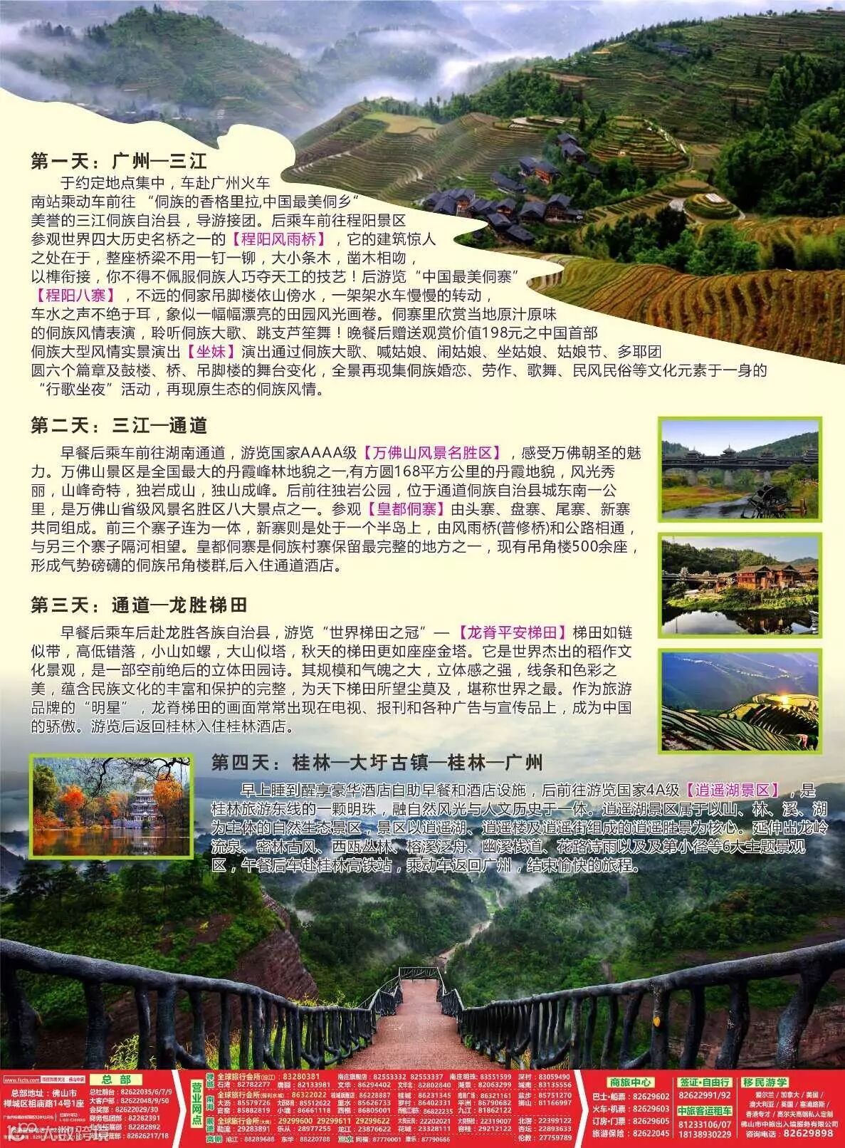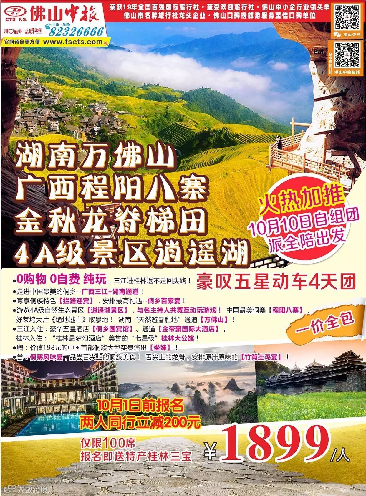 湖南通道万佛山、醉美侗寨、 广西三江程阳八寨、《坐妹》表演、金秋龙胜梯田、逍遥湖景区、豪叹五星动车 4 天纯玩团