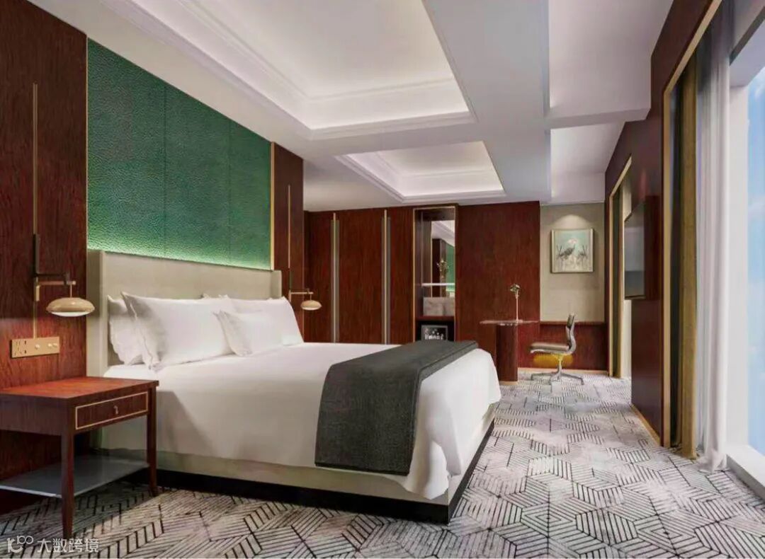 豪华房设计以民国风元素为理念,整体以淡雅的暖色木为主,配以橘色地毯及绿窗帘,点缀经典风格的茶几,挂画及地毯图案元素均来自江南的水乡印象。