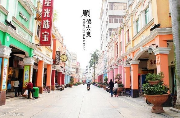 华盖路步行街是大良唯一一条商业步行街,是一条有岭南特色的商业步行街。街道两旁为明末清初骑楼特色的岭南西洋建筑,主色调为粉黄、粉绿、粉蓝。彩色的骑楼,老字号的民信双皮奶店。