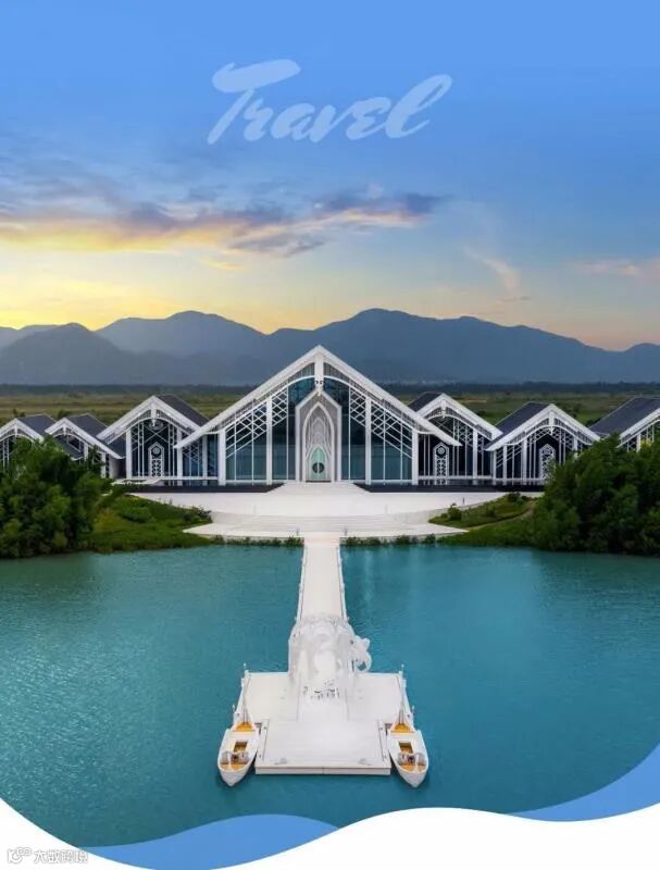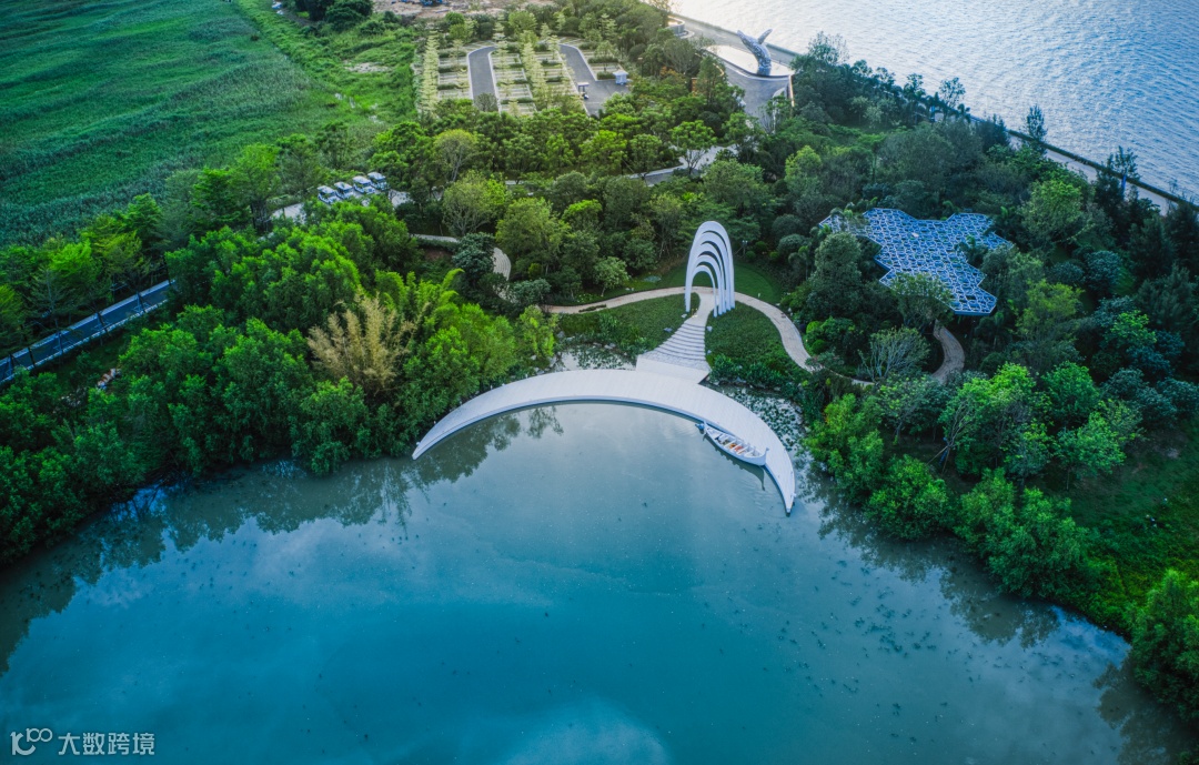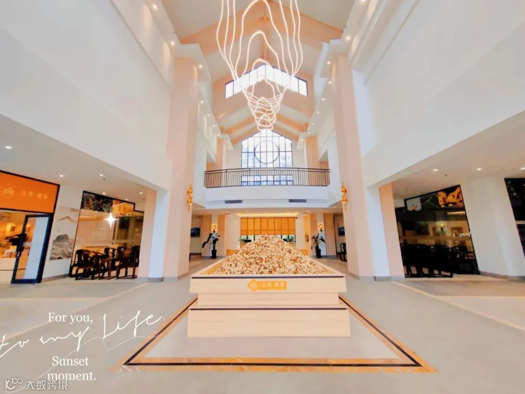 建筑灵感来源于古希腊苍穹之眼,整体造型也是由高科技 3D 打印技术精工雕琢,一体成型。通体纯白钢琴烤漆,在日光下与湖中倒影相映成趣,于平静的湖面中散发着闪耀般的光彩。顺着湖中长长的浮板桥,便可直走向度假中心前广场