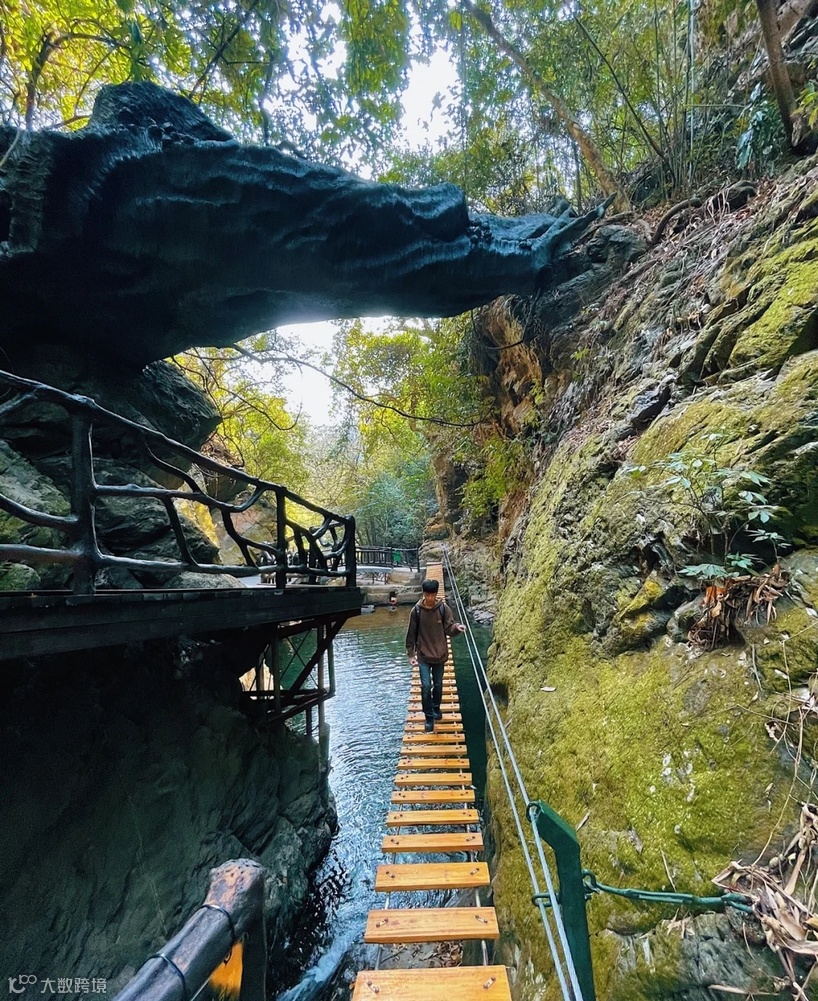 溯溪而上有众多的体验项目供游客参与:三瀑庐、洞天九曲桥、山溪浮艇、深山飞跃、惊心铁丝桥等等,都充满了挑战与激情。