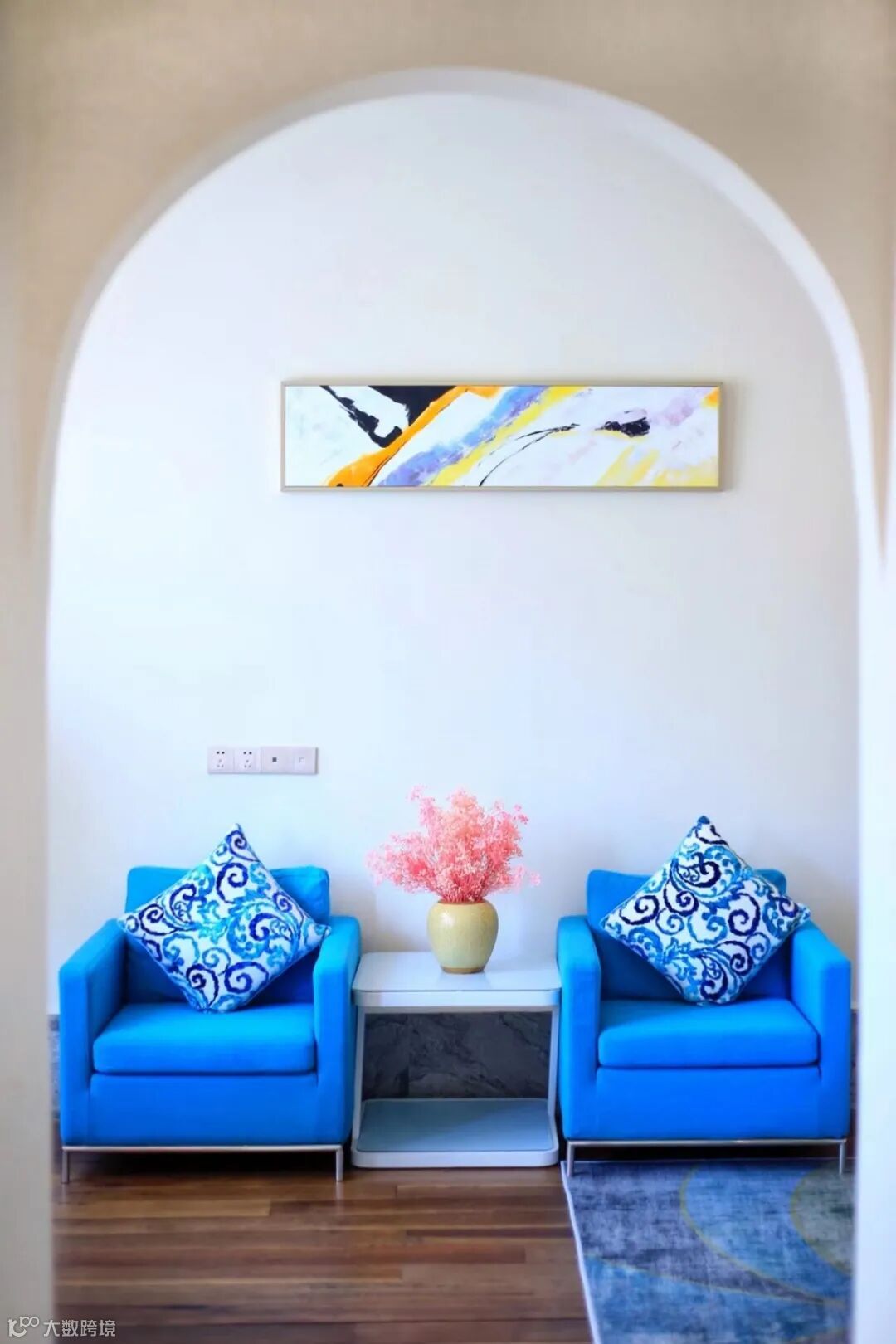 沙发、吊灯、壁画、餐盘、地毯