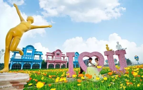 三座粉、蓝相间的巨型迪斯尼风格门楼,一片紫红色的千日红花田在阳光恬静地流敞着。七个巨型的气球“串”绽放缤纷色彩,边上还围着精美的花柱。香格里拉,正如其名,有着一种永恒、和平、宁静的 “世外桃源”。