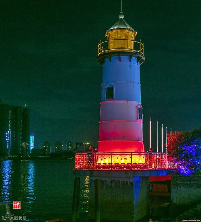 夜晚的渔人码头灯火璀璨,照得德胜河上波光粼粼,泛着五颜六色的光。作为标志性建筑的灯塔,屹立在德胜河道旁。