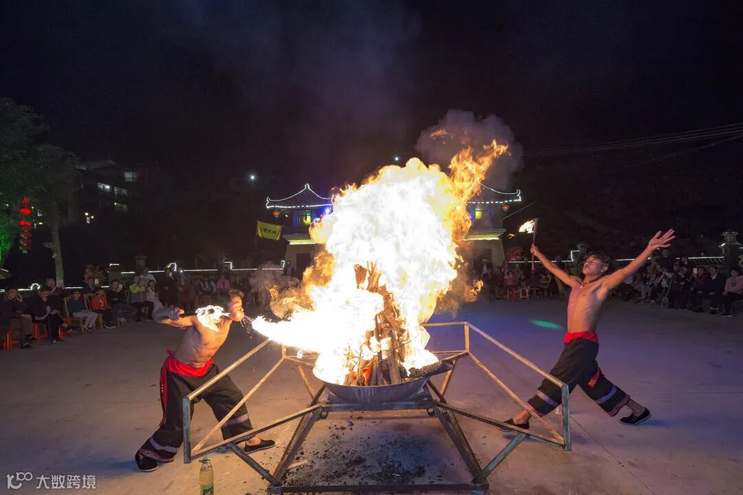 在南药广场酒店自组少数民族表演、竹竿舞、喷火杂技