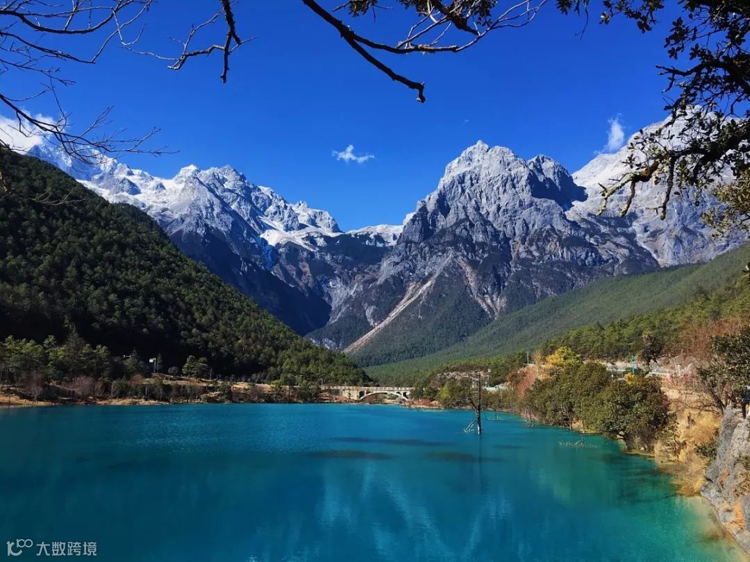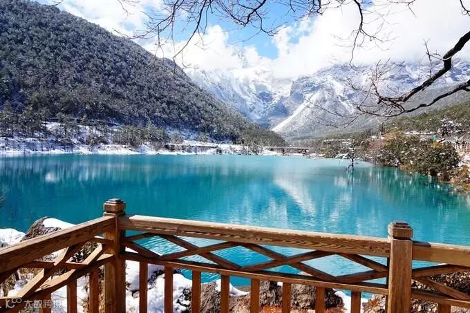 远看就像一轮蓝色的月亮镶嵌在玉龙雪山脚下