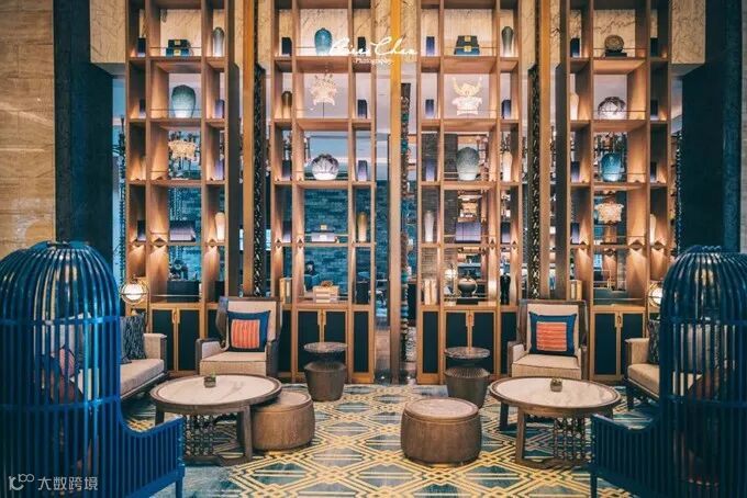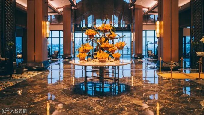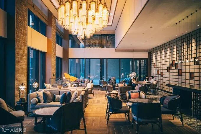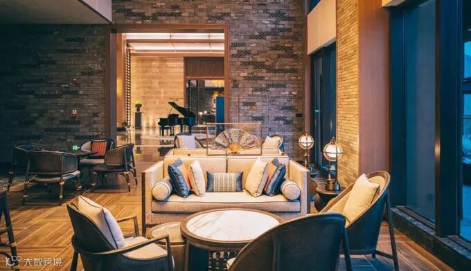 高雅的大堂设置了多个区域,包括休息区、大堂吧、露台,