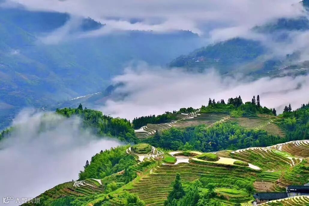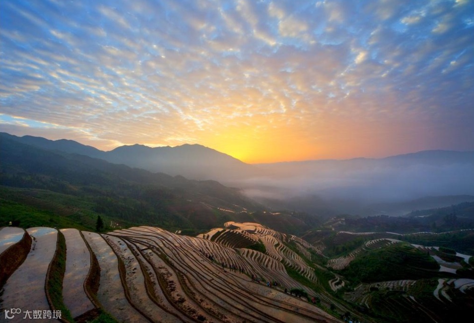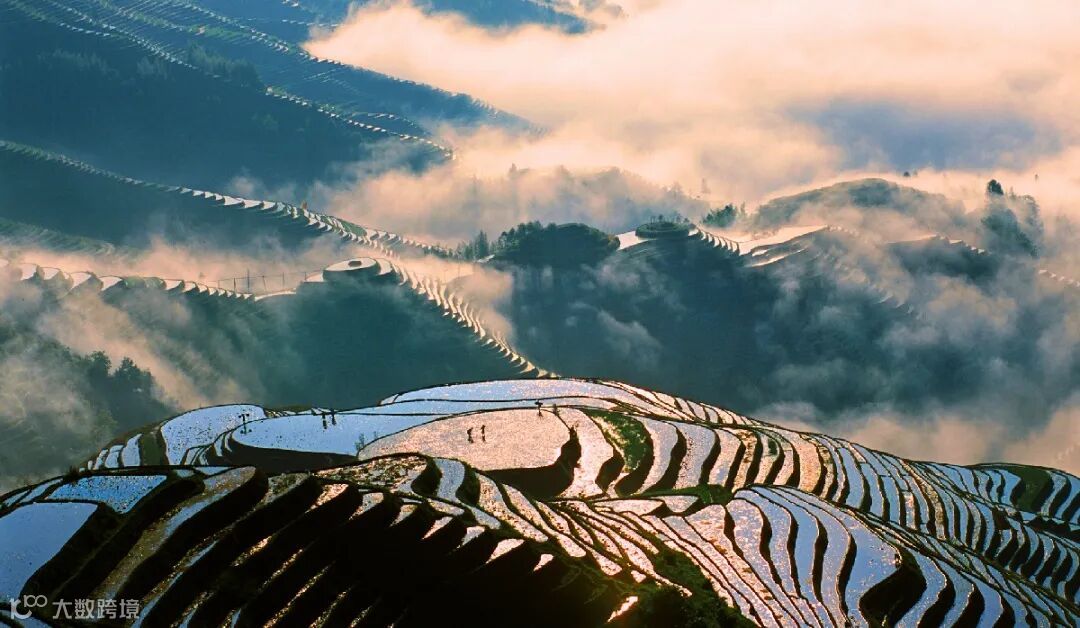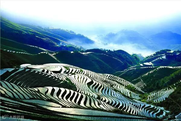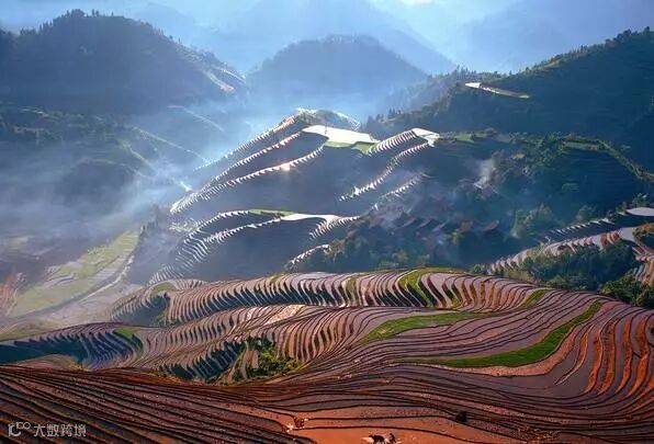 春季的梯田晨雾缠绕,恍如仙境,煞是好看,