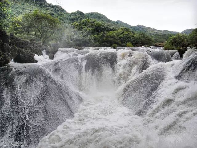 黄果树大瀑布以水势浩大著称,瀑布对面建有观瀑亭,游人可在亭中观赏汹涌澎湃的河水奔腾直洩犀牛潭。