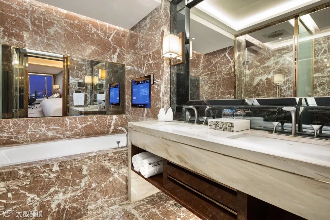 浴室均配有浴缸、淋浴间及LCD卫星电视!浴室空间宽敞布局设计合理,双人洗漱台,二胎家庭出游也不怕扎堆洗漱。