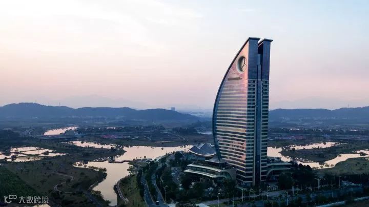 酒店远看成帆,近看却是“中国锦鲤”,“鱼身”是酒店主体,而"尾巴"则是大门口。临江而立的设计,让全部客房可以眺望江景。