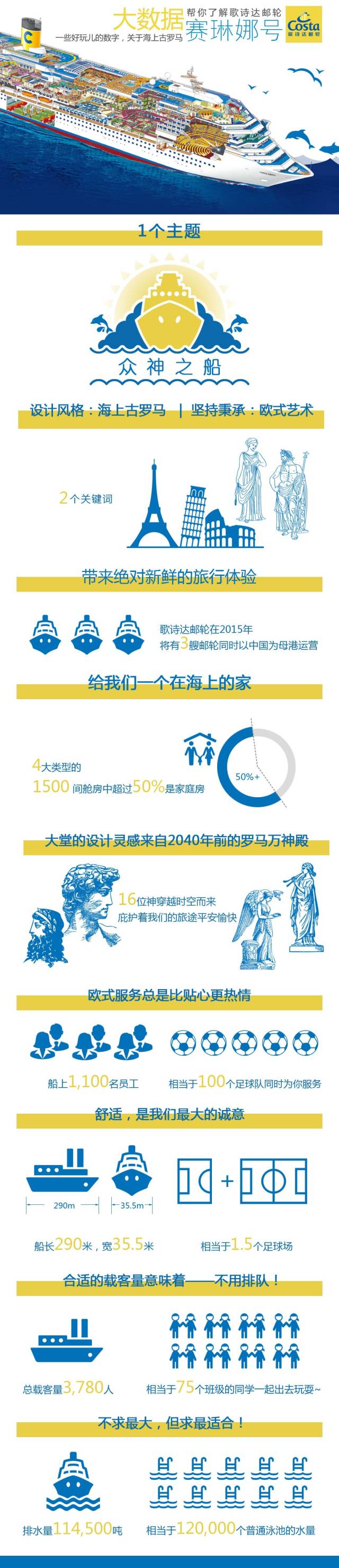 2015年4月24日,歌诗达邮轮在中国运营船队的第3艘邮轮——歌诗达邮轮赛琳娜号来到上海。这位新成员有着“众神之船”“海上古罗马”的美誉,船上以古罗马式风格为设计主题,处处洋溢着浓郁欧式风情。