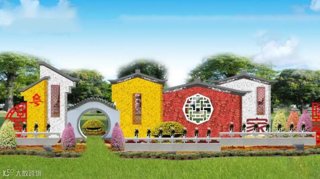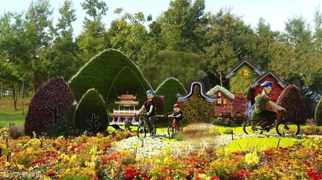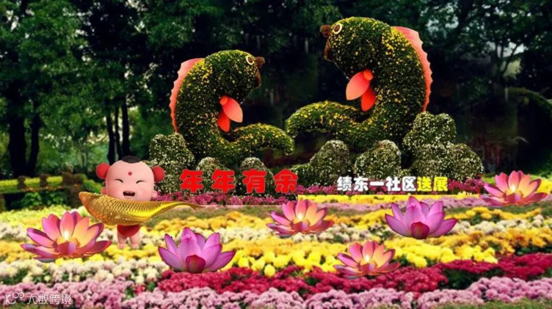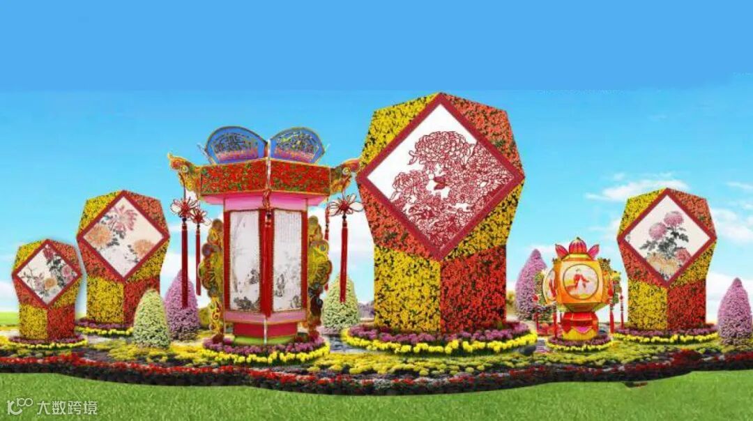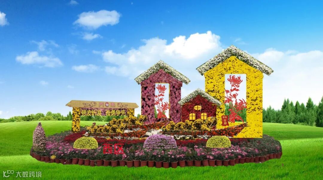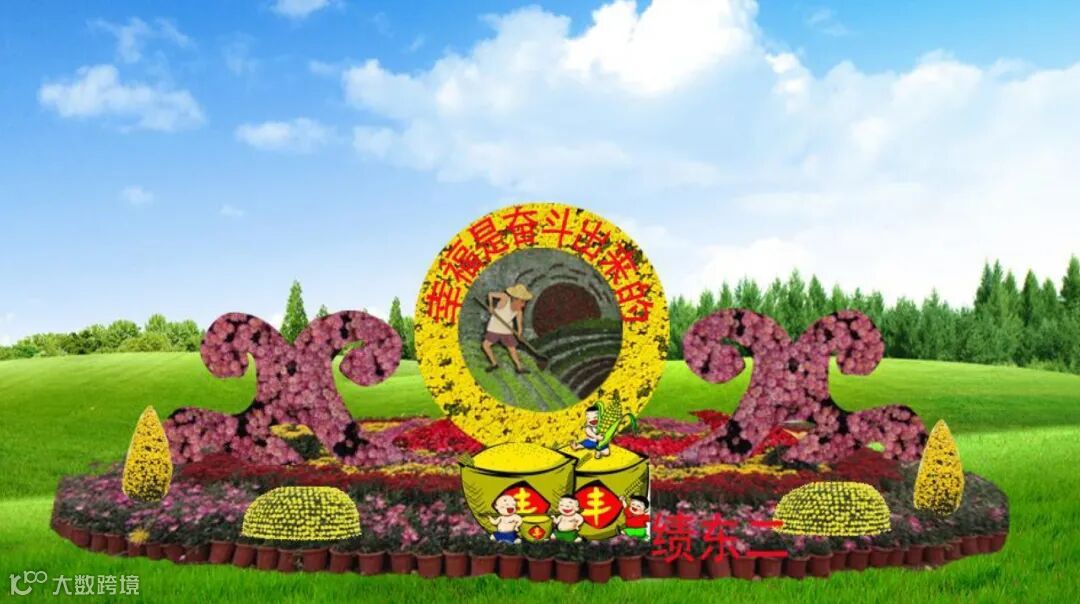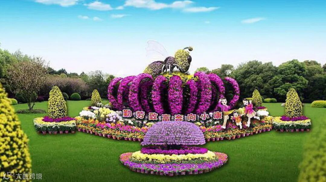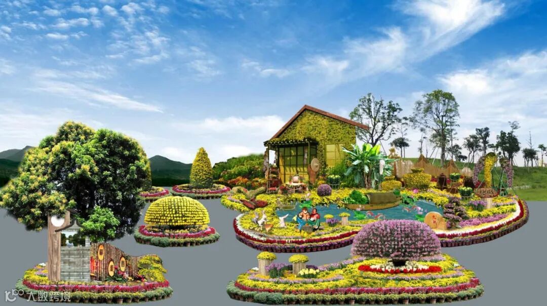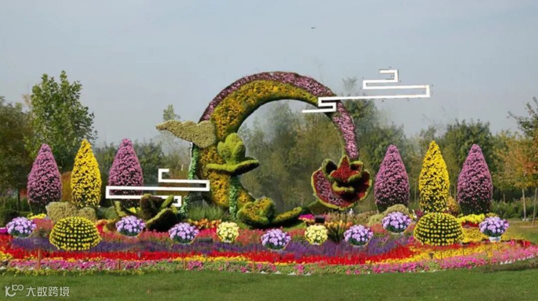 底部由各色菊花组成的图案花坛