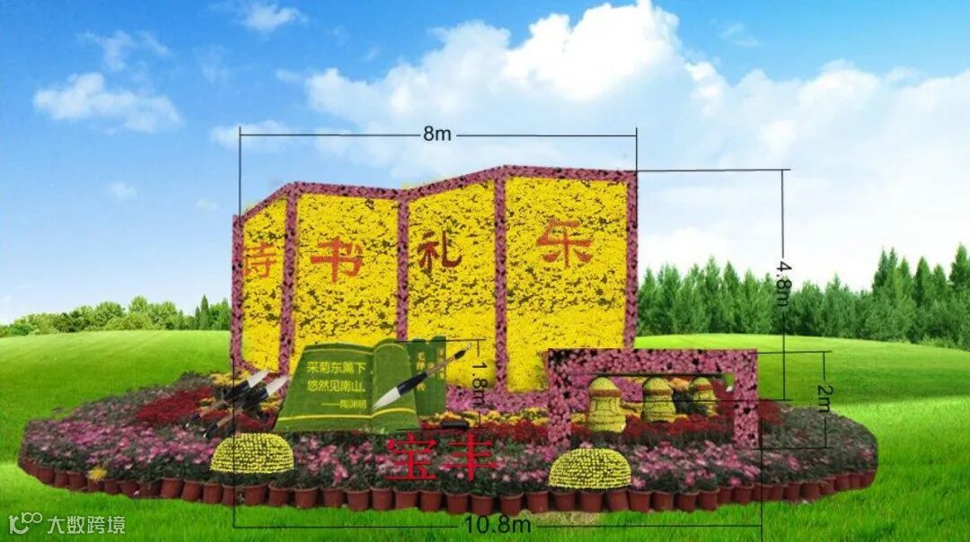 组景以“诗书礼乐”菊屏及书本毛笔等为元素