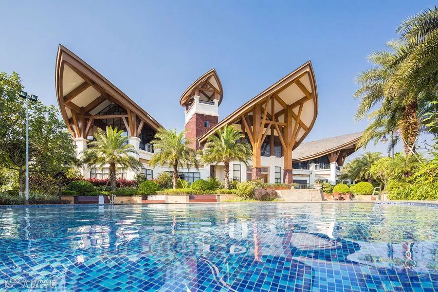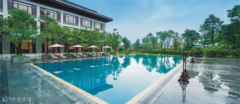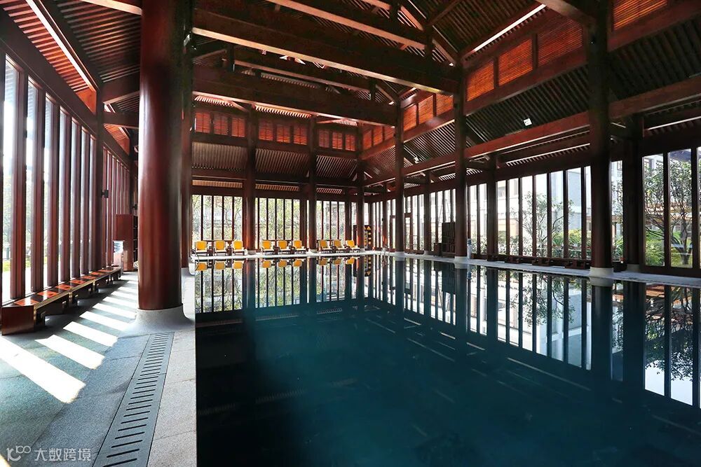 耗资3千万,采用全木质榫卯结构打造的室内游泳池,是继酒店大堂之后的又一传世经典。五开间回字廊双层歇山顶的中式建筑风格,气势磅礴,把传统的建筑技艺发挥的淋漓尽至。整体建筑木材采用非洲柚木,直上直下榫卯工艺,交错繁杂。游泳池四周由40个圆木柱支撑,最大圆木直径60厘米,最小40厘米,最高圆木15.85米,大梁跨度长13.06米。游泳池长25米,宽12米,深水1.7米,浅水1.2米,可供不同游泳爱好者畅游其中。