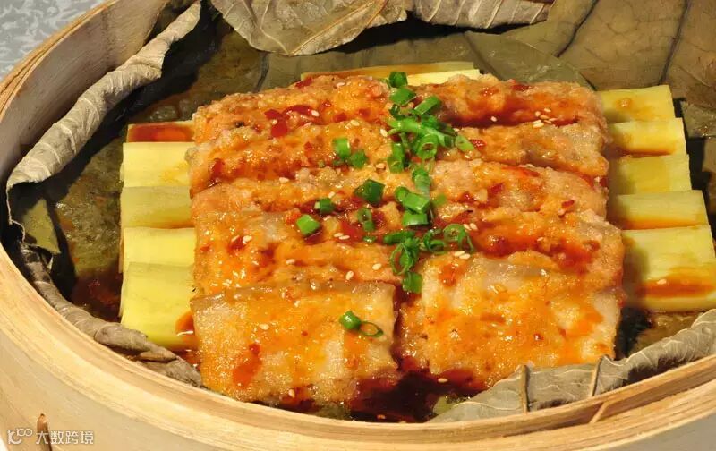 原料:五花肉500克、蒸肉米粉70克、料酒1茶匙、玫瑰腐乳汁2汤匙、生抽2茶匙、味精1/4茶匙、白糖1茶匙、干荷叶半张、姜3片、清水30毫升