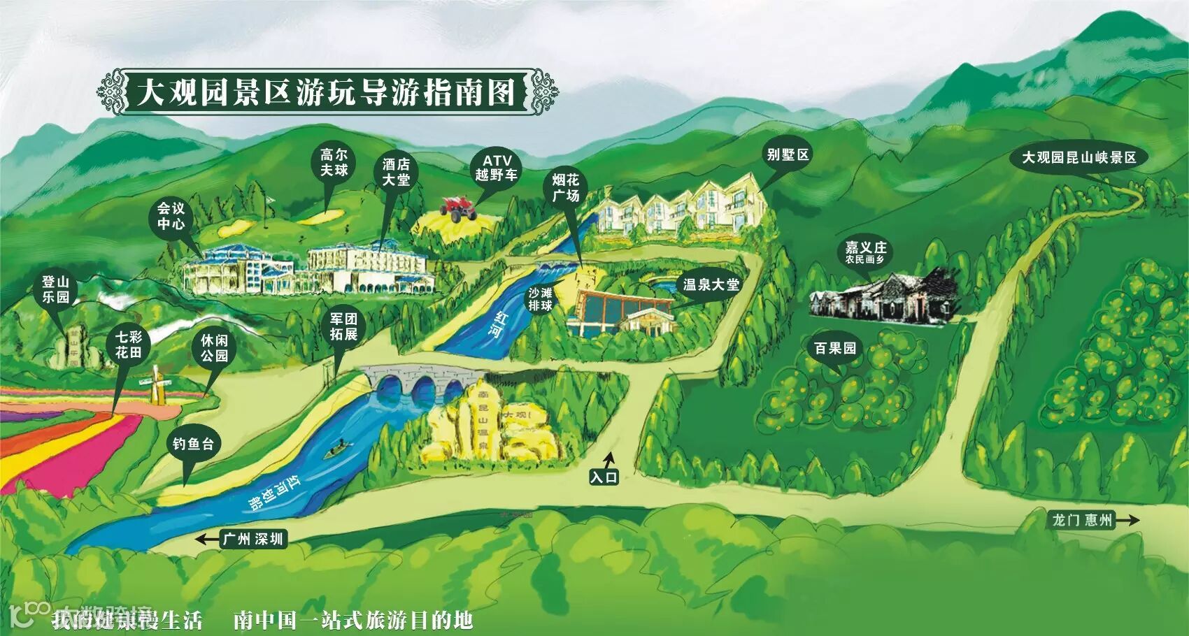 度假区内结合了中西餐饮为一体,其中中国饮食主要以酸、甜、咸、辣为主的最具独特风味的客家菜式,以及南昆山独有的菜式:观音菜、南昆竹笋等,也可品尝到广东的“三雄”--龙门胡须鸡。惠州龙门南昆山温泉大观园随着广河高速的开通,珠三角地区到大观园的交通更加便利,无论您在广州、深圳、东莞、还是惠州都只需要一小时车程便可以领略大观园“满园桃色关不住,水上世界更精彩”的绝妙感受。