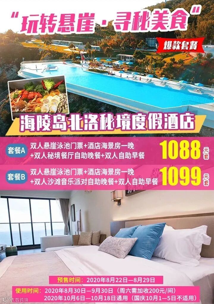 套餐A:¥1088/套,双人悬崖泳池门票+酒店海景房一晚+双人秘境餐厅自助晚餐+双人自助早餐